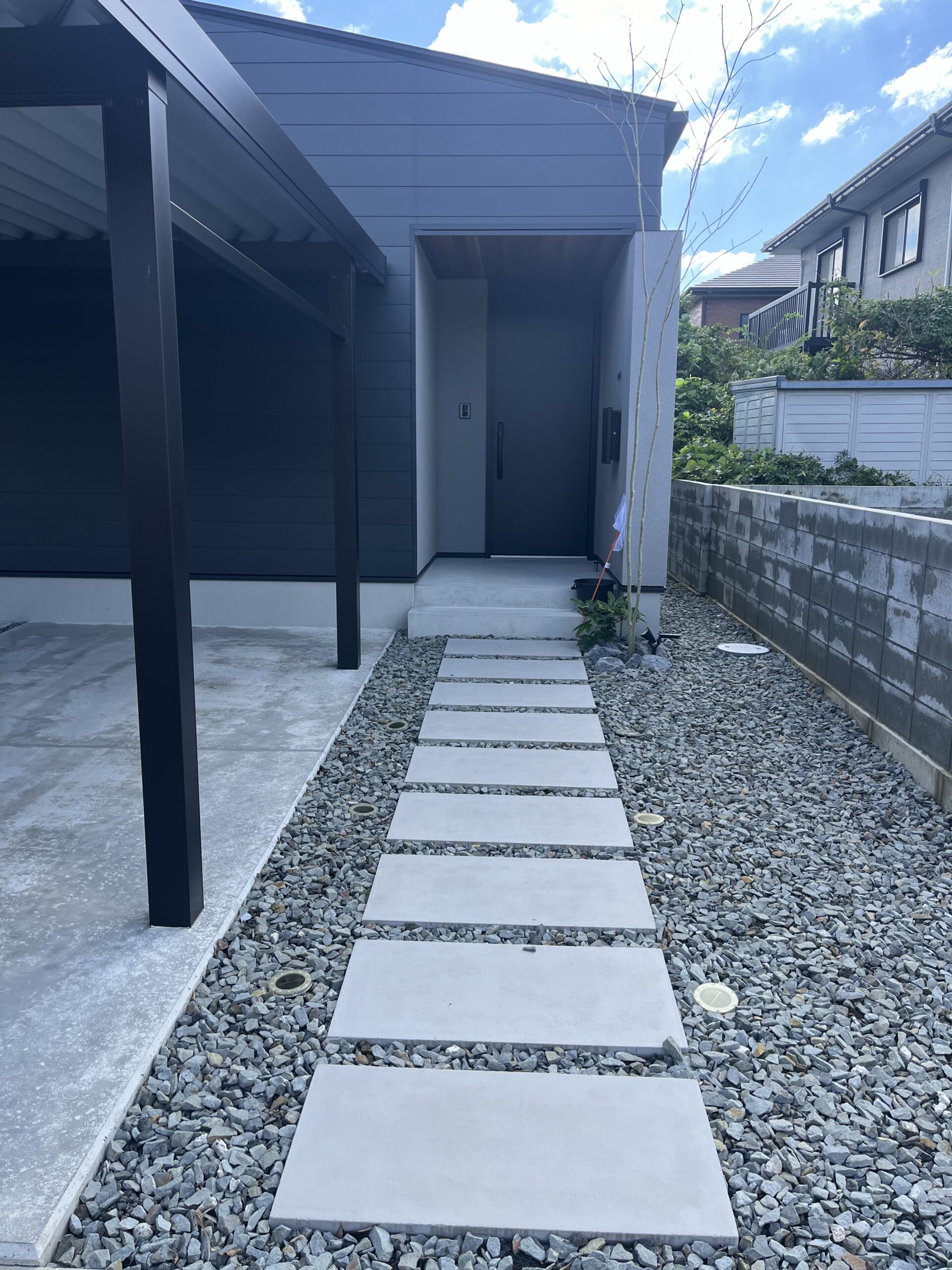 外観は三角屋根が印象的で、内部の勾配天井と組み合わせることで、リビングやダイニングに視覚的な広がりと開放感を演出。