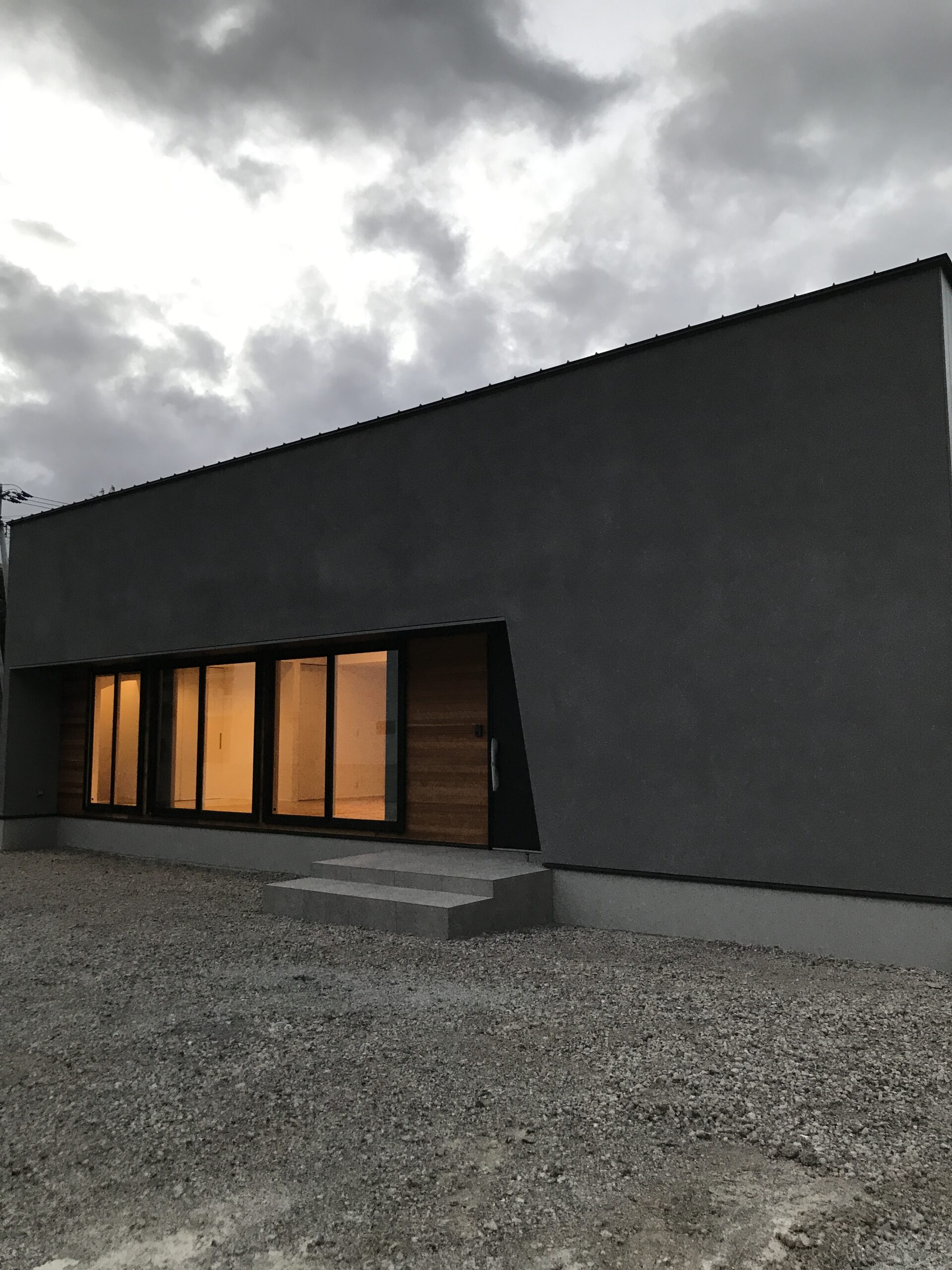 シンプルなファサードが印象的な、大きなニワとテラスをもつ平屋建て住宅。